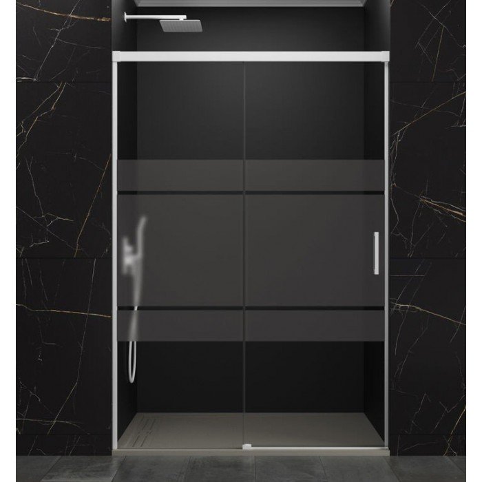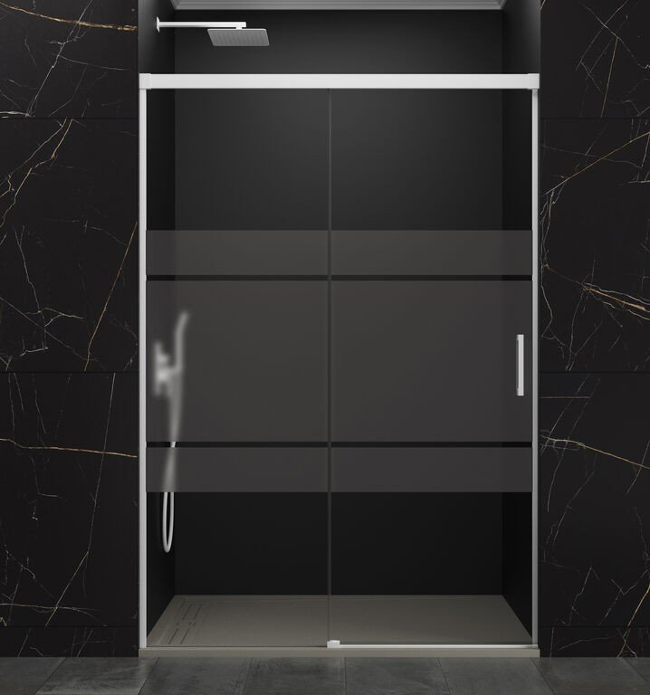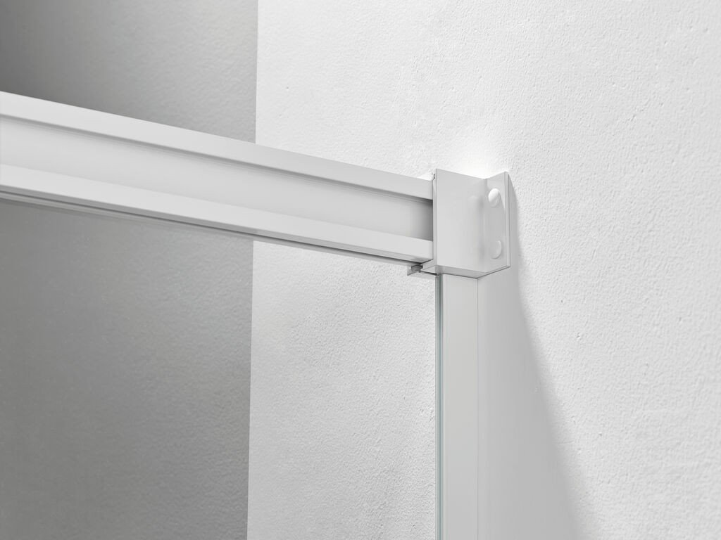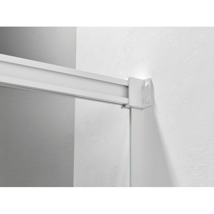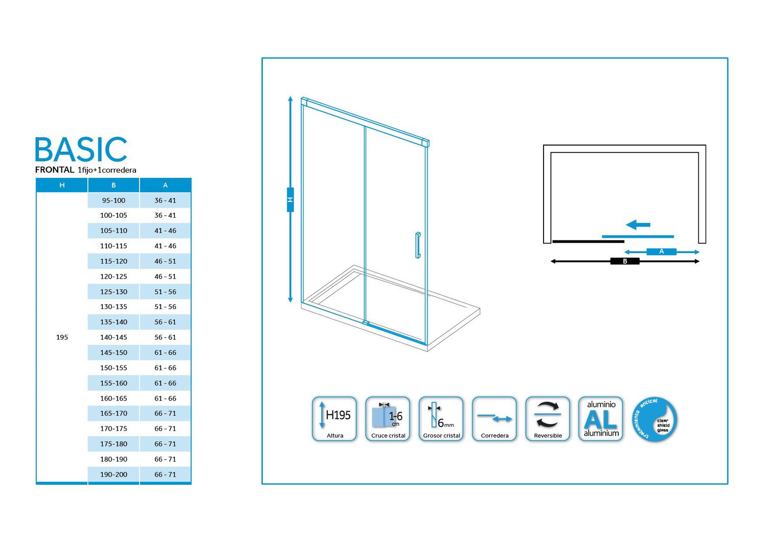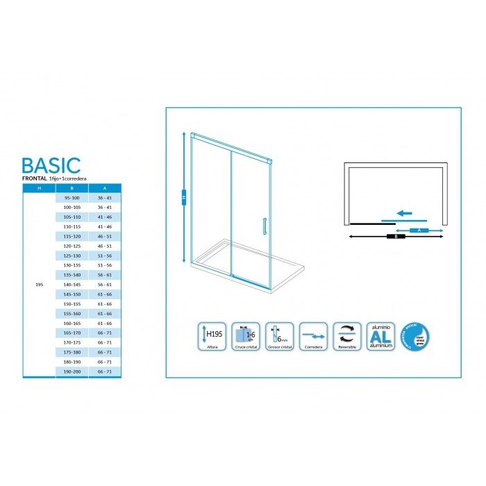 Modelo: Basic. Altura: 1,96 cm. Medidas: Anchos de 95 a 200 cm. Composición: Fijo y corredera. Vidrio: Templado de seguridad transparente o serigrafiado. Grosor: Frontal 6 mm. Fácil limpieza: Tratamiento anti-cal aplicado. Perfiles: De aluminio anonizado. Color: Blanco mate. Cierre: Oculto. Perfil inferior: Sin perfil inferior. Rodamientos: Superiores y regulables. Reversible: Si, no hay que elegir lado.