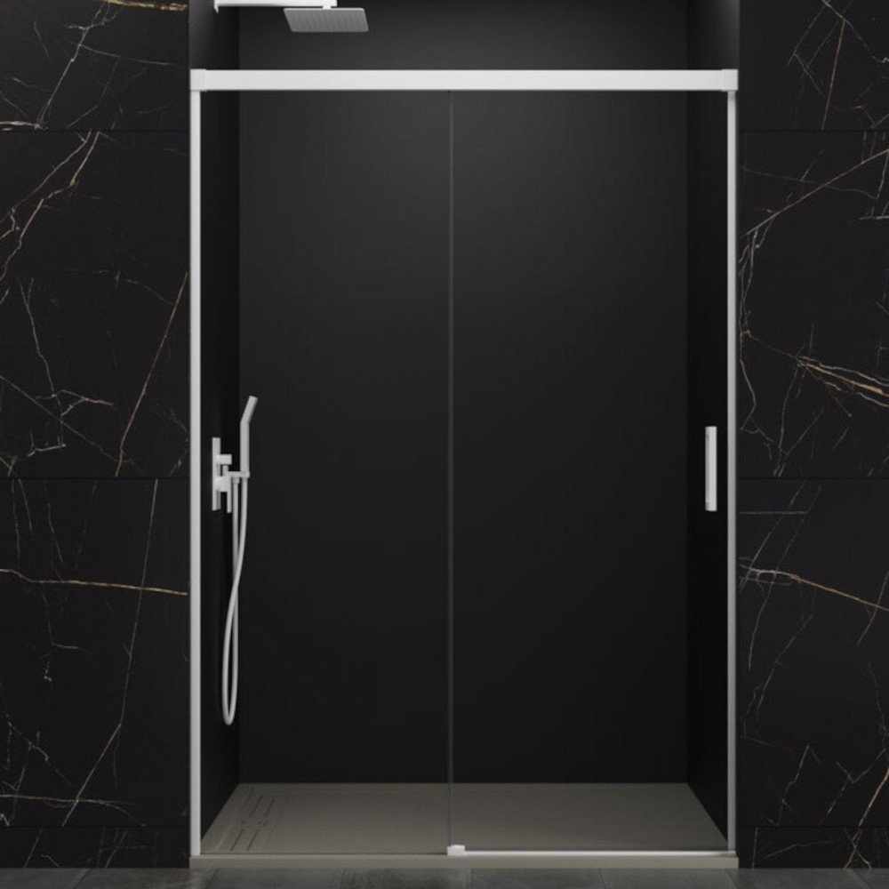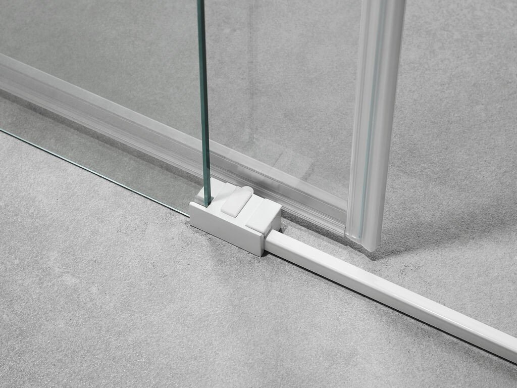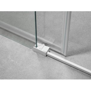 Mampara de ducha en blanco mate, en frontal fijo y corredera. Modelo Basic, este modelo de mampara se caracteriza por tener los perfiles estilo minimalista en blanco, por compensarse la medida por el perfil superior, lo que hace que los perfiles laterales sean muy delgados.