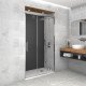 Modelo: Trio. Altura: 1,95 cm. Medidas: Anchos de 86 hasta 161 cm. Composición: Fijo y dos hojas correderas. Vidrio: Templado de seguridad transparente. Grosor: 6 mm. Fácil limpieza: Tratamiento anti-cal aplicado. Perfiles: De aluminio anonizado. Cierre: Oculto. Color: Plata brillante. Perfil inferior: Sin perfil inferior. Rodamientos: Dobles y regulables. Reversible: Si, puede ir fijo izquierda o derecha.