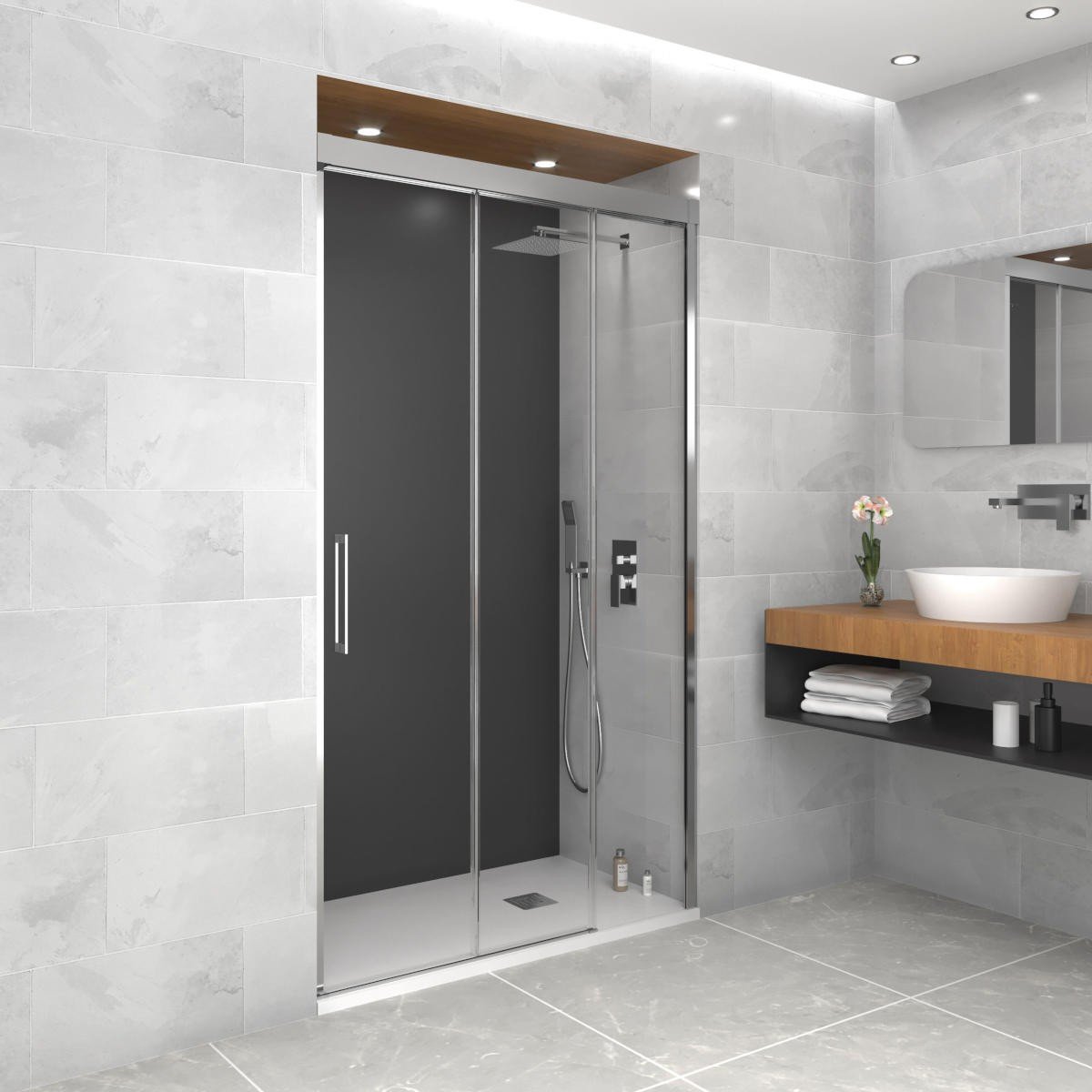Mampara de ducha frontal, compuesta de 1 vidrio fijo más 2 hojas correderas, modelo Trio, esta mampara es muy útil ya que deja más espacio para entrar a nuestro baño, que una en fijo y corredera, además este modelo no lleva perfil inferior, para facilitar aun mas la entrada.