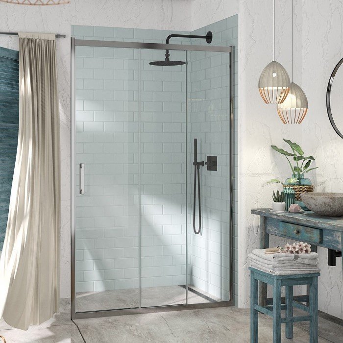 La mampara de ducha frontal modelo Kaarol, es una mampara compuesta de una hoja y dos hojas correderas, sin perfilería vertical entre vidrios, es la mampara con mayor apertura del mercado en puertas corredera, gracias a su sistema de apertura y cierre de la mampara con sistema de arrastre en las puertas. Gracias a tener más apertura podemos colocar la mampara desde medidas muy pequeñas.