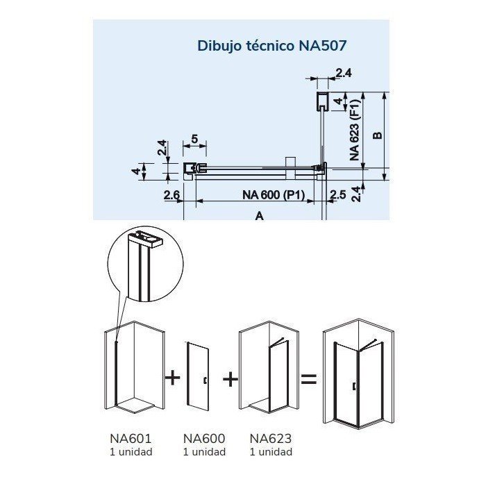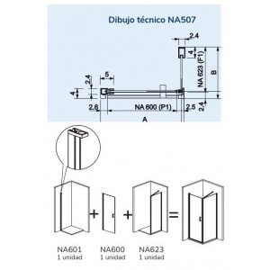 Modelo: Nardi NA507. Altura: Perfil 1,95 y vidrios a 1,92 cm. Medidas: Frontal de 52,5 a 79 cm y lateral fijo de 66,5 a 89 cm. Composición: Frontal un abatible más lateral fijo. Vidrio: Templado de seguridad transparente. Grosor: 6 mm. Fácil limpieza: Tratamiento anti-cal aplicado. Perfiles: De aluminio anonizado. Color: Oro cepillado. Soporte: Una barra de 45 grados. Perfil inferior: Sin perfil inferior. Cierre: Magnético. Reversible: Si, no hay que elegir lado.