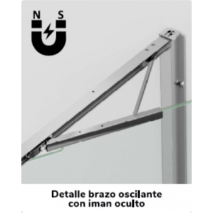 Mampara de ducha angular compuesta por una puerta abatible de 8 mm y un lateral fijo de 6 mm, ideal para optimizar el acceso en espacios reducidos. La puerta gira hacia el interior con ayuda de un brazo oscilante con imán oculto, garantizando una apertura cómoda y segura sin invadir el baño.