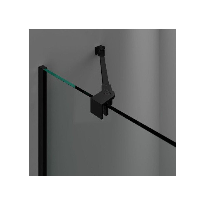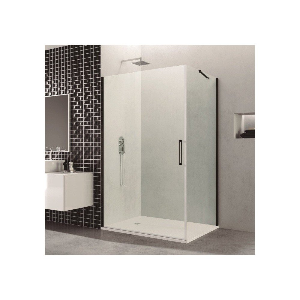 Mampara de ducha frontal con 1 puerta abatible, más lateral fijo en negro mate, modelo Open Combi Black A Rec, es una mampara que lleva un fijos con brazo a 45 grados, y un abatible con el perfil provisto de un sistema de elevación al girar la hoja abatible, integrado en el perfil vertical, mediante el cual la puerta se eleva conforme la abrimos, mas un lateral fijo para cerrar platos de ducha rectangulares.