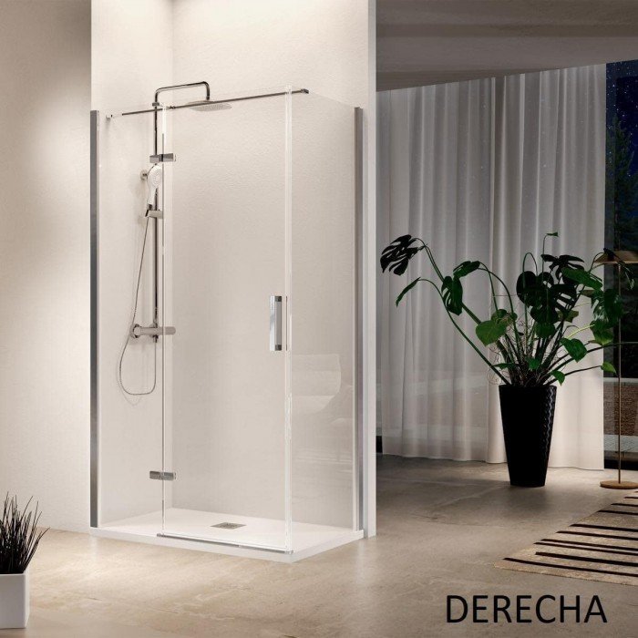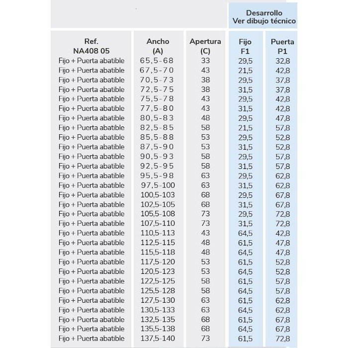 Modelo: Nardi NA408. Altura: 1.92,5 cm. Medidas: Anchos de 65,5 hasta 140 cm y lateral de 66,5 a 89 cm. Composición: Un fijo y una abatible más un lateral fijo. Vidrio: Templado de seguridad transparente. Grosor: 6 mm. Fácil limpieza: Tratamiento anti-cal aplicado. Perfiles: De aluminio anonizado. Color: Plata brillante. Soporte: Barra paralela. Perfil inferior: Sin perfil inferior. Cierre: Magnético. Reversible: No, hay que elegir lado.
