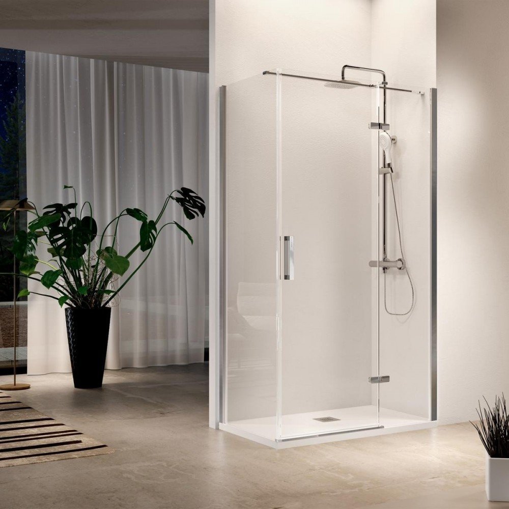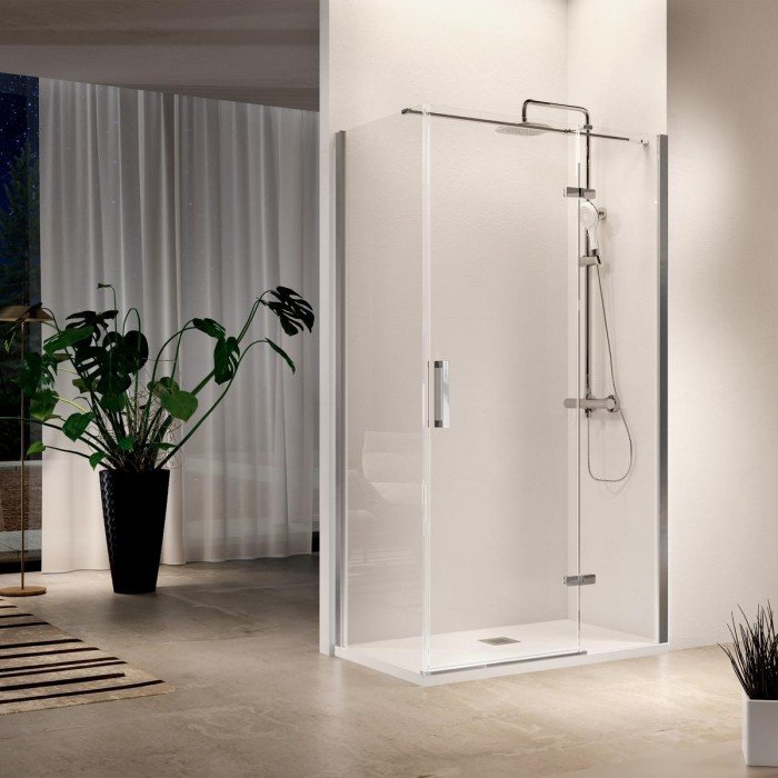 Mampara de ducha frontal con 1 hoja fija y 1 puerta abatible más lateral fijo, modelo Nardi NA408, es una mampara que lleva una barra paralela de sujeción adecuada a la medida que se solicite, la cual sustitute a las barras de 45 grados, y es más estatico,con una hoja abatible con bisagras que abre hacia fuera, en la parte frontal.