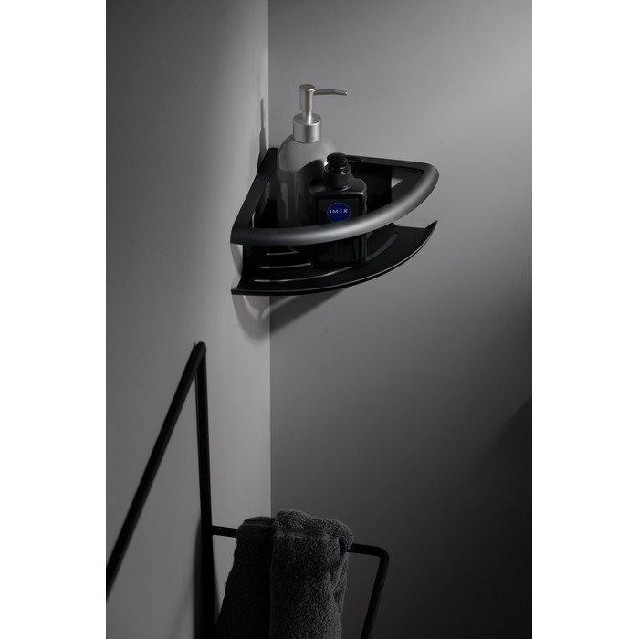 Jabonera en rincón Dhanu acabado negro mate, en Acero S304.