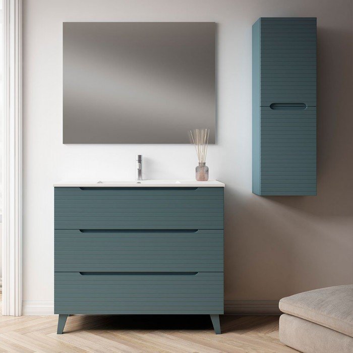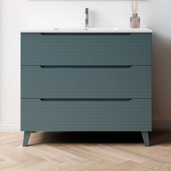 El Mueble de baño BORNEO de 3 cajones con patas ya viene montado de fábrica, solo tendrá que colocar el lavabo .Este mueble se instala suspendido de la pared .Incluye mueble de baño con lavabo cerámico .Producto fabricado en España de máxima calidad .Mueble de baño fabricado con tableros de párticulas de densidad media (DM o MDF) + recubrimiento de melamina en colores madera . El acabado del conjunto es en azul oceano mate .Entrega y garantía: 2 años sobre defecto de fábrica, desde el momento en el que el producto fue enviado .