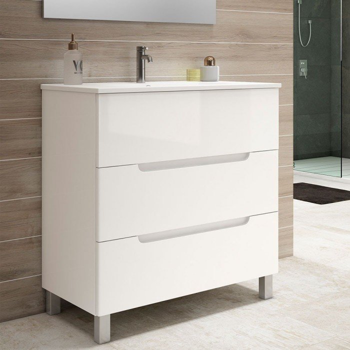 Incluido mueble, lavabo, espejo y aplique led. mueble de baño vision 80 blanco 3 cajones con patas