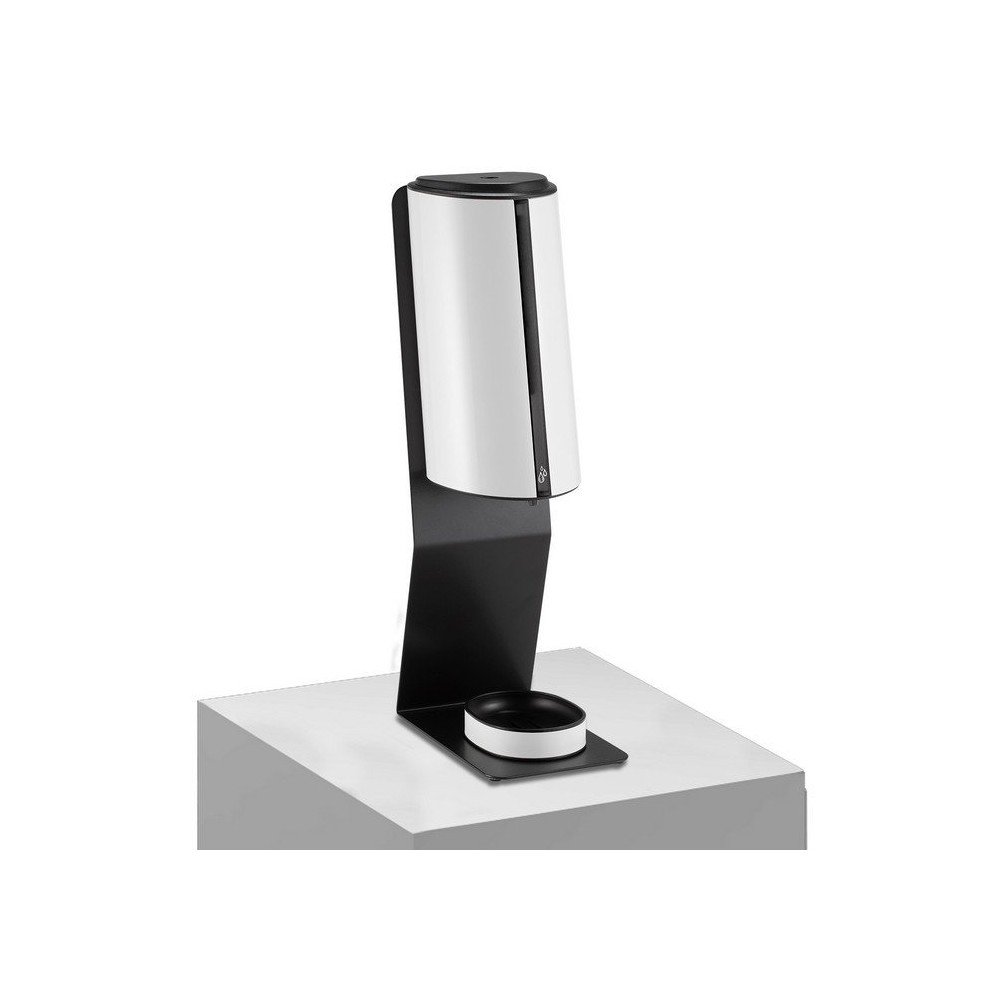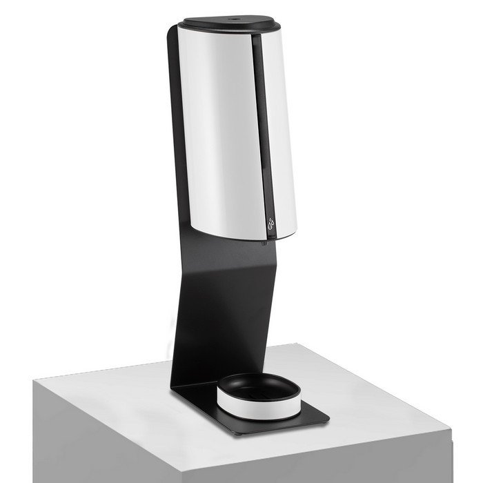 Dispensador de gel hidroalcohólico automático 850ml. Con stand de sobremesa lacada en epoxi negro y recipiente para salpicaduras. La protección que otorga el epoxi otorga resistencia a la bandeja no se deteriore.