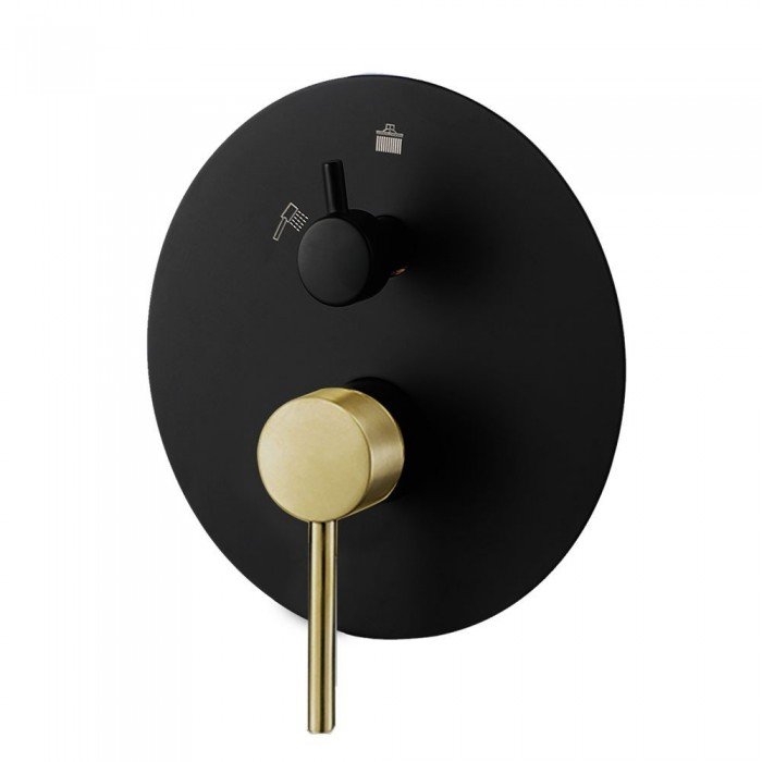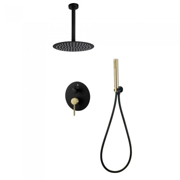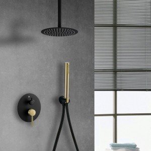 Grifo monomando de ducha para empotrar VALDES. Salida techo. Acabado redondo en negro mate y oro.