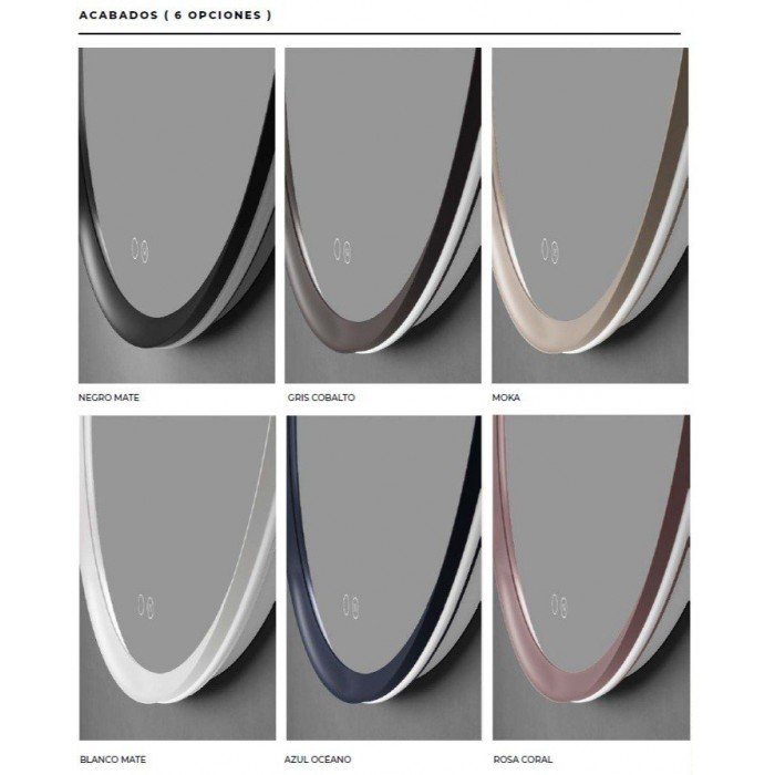 - Marco de aluminio en seis acabados: negro mate, blanco mate, moka, gris cobalto, azul océano y rosa coral