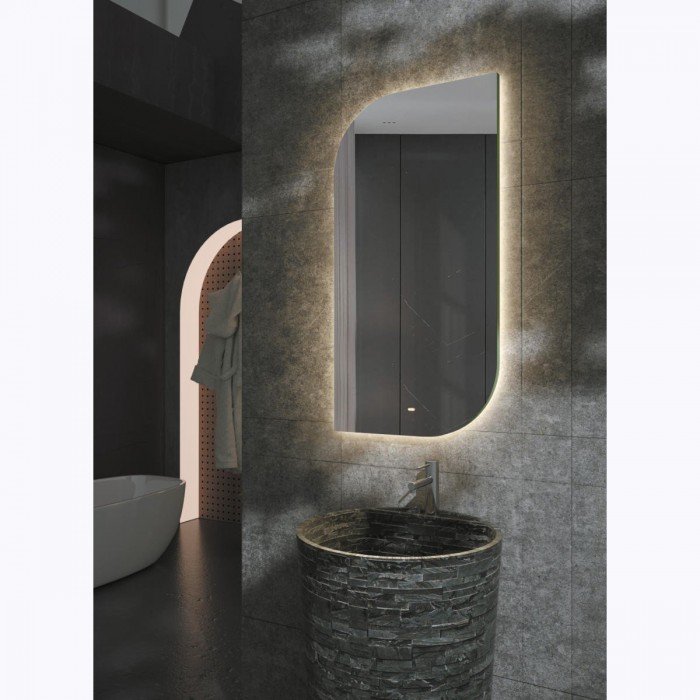 Espejo rectangular con dos esquinas en acabado redondo y dos esquinas en acabado cuadrado de luz retroiluminada.