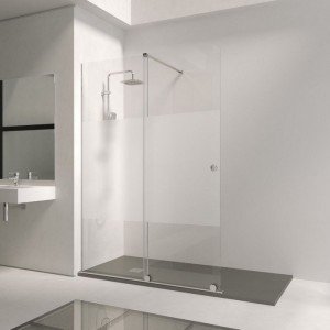Modelo: Bron. Altura: 1,95 cm. Medidas: Anchos de 95 hasta 180 cm. Composición: Fijo y corredera sin cierre. Vidrio: Templado de seguridad transparente o serigrafiado. Grosor: 8 mm fijo y 6 mm corredera. Fácil limpieza: Tratamiento anti-cal aplicado. Perfiles: De acero inoxidable. Color: Cromo. Perfil inferior: Con perfil inferior, y sin perfil superior. Soporte: Barra de acero extensible. Cierre: Magnético. Rodamientos: Vistos de gran calidad que corren por el rail inferior. Reversible: Solo en transparente.