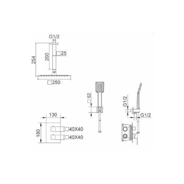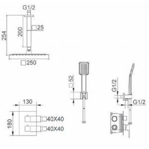 Ducha empotrada Ons IMEX. Grifería termostática de latón cromado, 2 vías con caja de registro. Tubo salida techo latón. Mango ducha cuadrado.