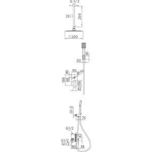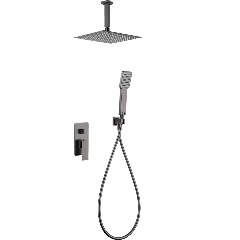 Rociador de acero inox. S.304 25x25cm, extraplano, acabado bgm y antical. Tubo salida techo de latón acabado black gun metal. Mango de ducha cuadrado de 1 posición.