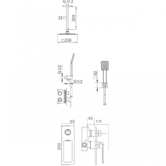 Rociador de acero inox. S.304 25x25cm, extraplano, acabado blanco y antical. Tubo salida techo de latón acabado blanco. Mango de ducha cuadrado de 1 posición.