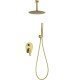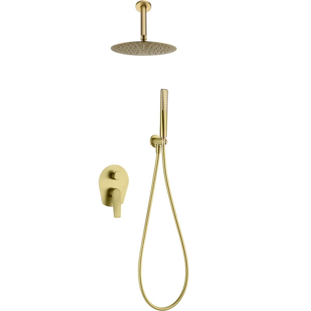 Rociador de acero inox. S.304 Ø25 cm, extraplano, acabado oro cepillado y antical. Tubo salida techo de latón acabado oro cepillado. Mango de ducha redondo de 1 posición.