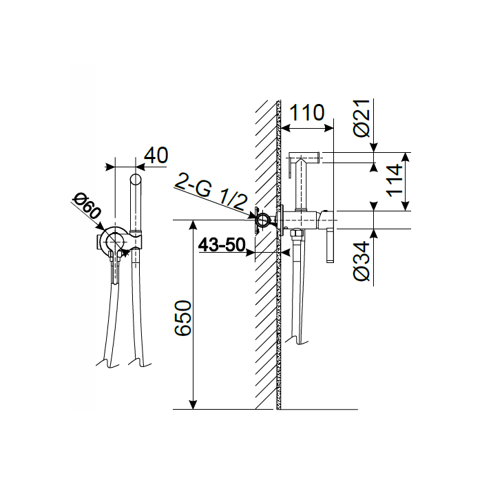 Grifo de bidé empotrado Bambú, hidroescobilla en negro mate, agua fría y caliente, flexo en acero 120 cm longitud.