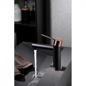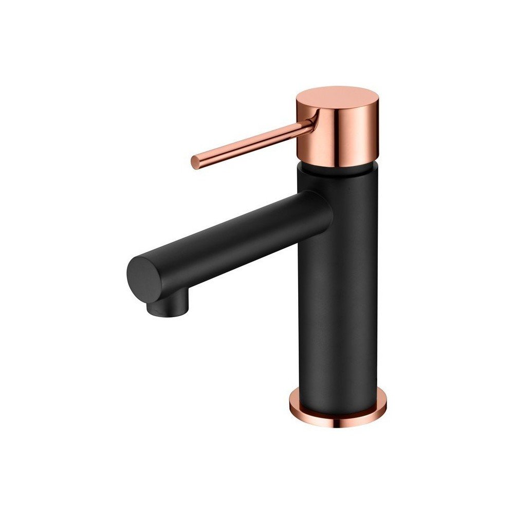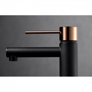Monomando de lavabo milos. Cuerpo de grifería en Latón negro mate y oro rosa brillo. Cartucho cerámico Citec de 25 mm.