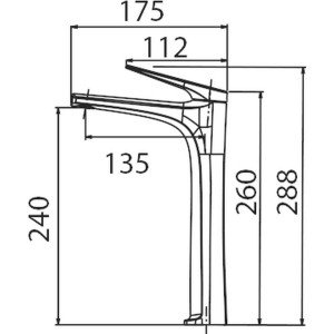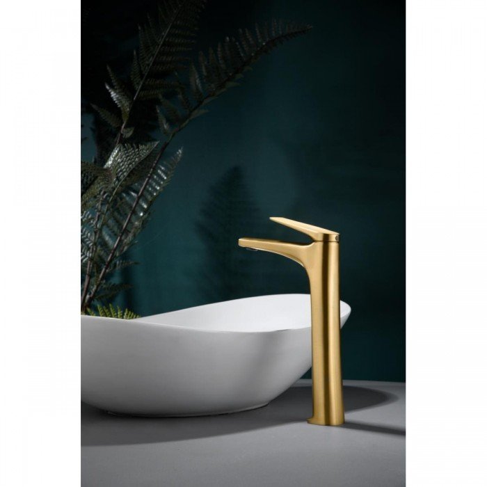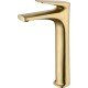 Monomando caño alto de lavabo Delos. Cuerpo de grifería en oro cepillado. Cartucho cerámico 28 mm.