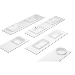 Es un lavabo de tipo semi encastre que puede colocarse en una estructura hueca de un mueble, encimera o tapa, de forma que el lavabo resulta con diversos salientes, creando la sensación de un elemento único entre el mueble y el lavabo.