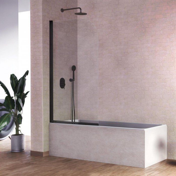 La mampara de bañera de una hoja abatible Rita, en negro mate, este modelo de mampara de bañera la tenemos en una medida de 85 a 86 cm, es una mampara básica para cualquier bañera, que nos cubre de salpicaduras de forma sencilla, esta mampara es de las más vendidas, por su gran relación calidad precio, tiene la esquina de arriba redondeada, lo que le da un diseño diferente al resto.