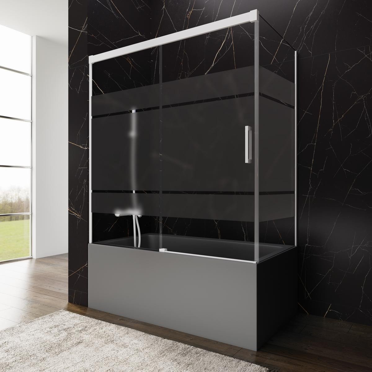 Este modelo tiene la posibilidad de elegir el vidrio con serigrafia, por si queremos más intimidad en nuestro baño, ya que tiene unas franjas vinílicas blancas, ya instaladas en fábrica.
