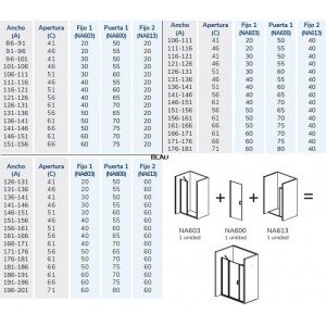 Modelo: Nardi NA517. Altura: 1,95 cm. Medidas: Anchos de 86 hasta 202 cm. Composición: Frontal dos fijos y una abatible central. Vidrio: Templado de seguridad transparente. Grosor: 6 mm. Fácil limpieza: Tratamiento anti-cal aplicado. Perfiles: De aluminio anonizado. Color: Plata brillante. Soporte: Dos barras de 45 grados. Perfil inferior: Sin perfil inferior. Cierre: Magnético. Reversible: Si, no hay que elegir lado.