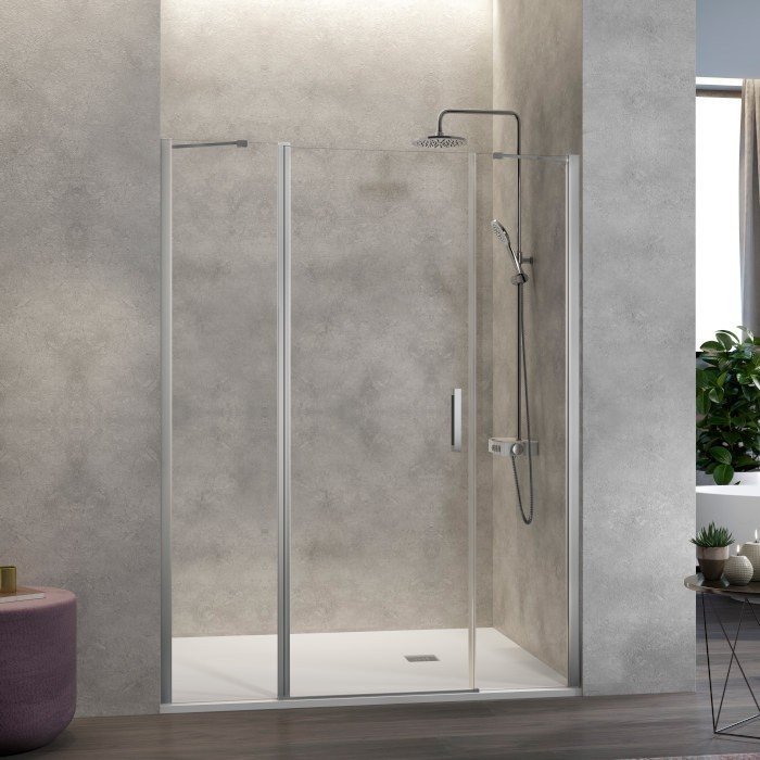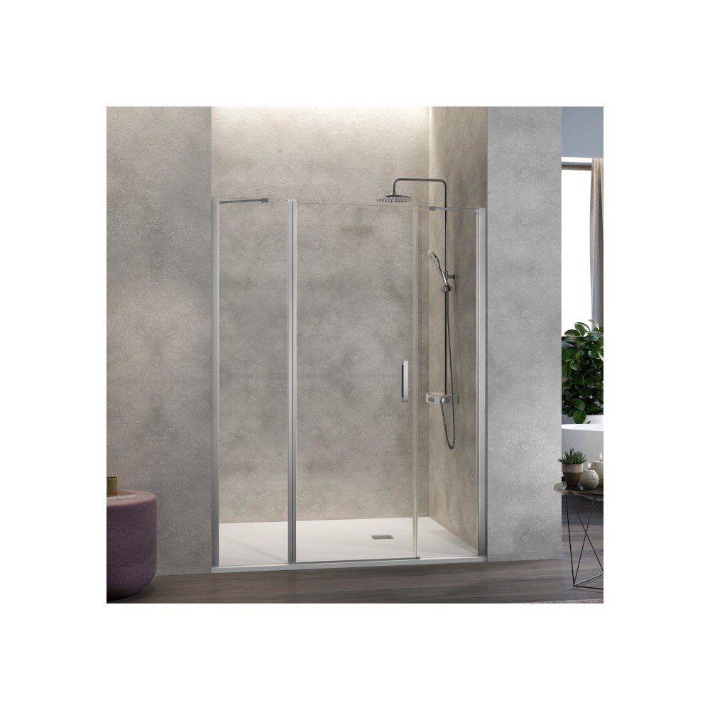 Mampara de ducha frontal con 2 hojas fijas y 1 puerta abatible en el centro, modelo Nardi NA517, es una mampara que lleva dos con un brazo a 45 grados, y con una hoja abatible con perfil para poder abrir dentro y fuera. Es un tipo de formato muy útil en espacios donde tenemos elementos a ambos lados y queremos entrar con una puerta por el centro, con la máxima apertura.