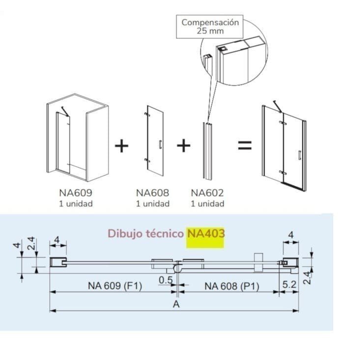 Modelo: Nardi NA403. Altura: 1.92,5 cm. Medidas: Anchos de 70 hasta 145 cm. Composición: Un fijo y una abatible. Vidrio: Templado de seguridad transparente. Grosor: 6 mm. Fácil limpieza: Tratamiento anti-cal aplicado. Perfiles: De aluminio anonizado. Color: Negro mate. Soporte: Una barra de 45 grados. Perfil inferior: Sin perfil inferior. Cierre: Magnético. Reversible: No, hay que elegir lado.