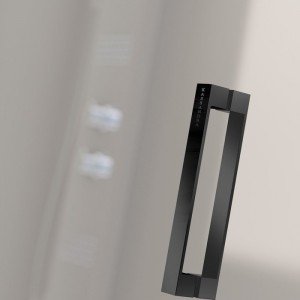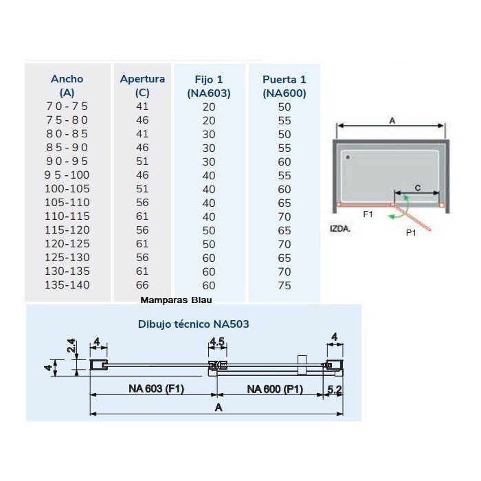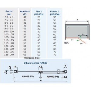 Modelo: Nardi NA503. Altura: 1,95 cm. Medidas: Anchos de 70 hasta 140 cm. Composición: Un fijo y una abatible. Vidrio: Templado de seguridad transparente. Grosor: 6 mm. Fácil limpieza: Tratamiento anti-cal aplicado. Perfiles: De aluminio anonizado. Color: Negro mate. Soporte: Barra de 45 grados. Perfil inferior: Sin perfil inferior. Cierre: Magnético. Reversible: Si, no hay que elegir lado.