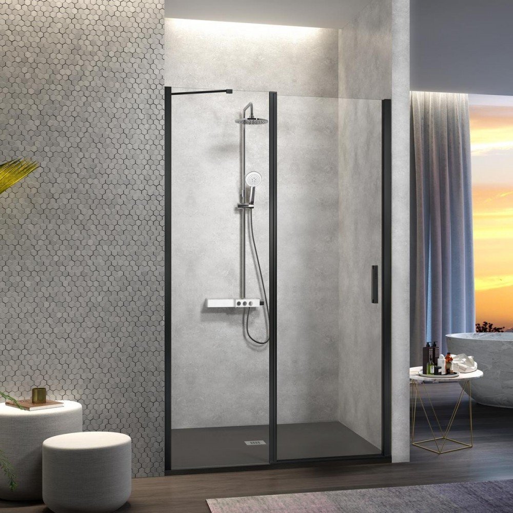 Mampara de ducha frontal con 2 hojas, una de ellas abatible y la otra fija, modelo Nardi NA503 en negro mate, es una mampara que lleva un brazo a 45 grados en el fijo, y con una hoja abatible con perfil para poder abrir dentro y fuera. Es un tipo de formato muy utilizado en los baños, ya que deja bastante apertura.