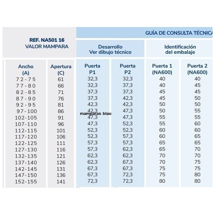 ANCHO* Son los rangos que tiene la mampara para su montaje, cualquier medida dentro del rango es válida, su hueco debe de tener una medida dentro del rango.