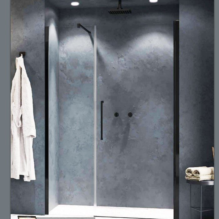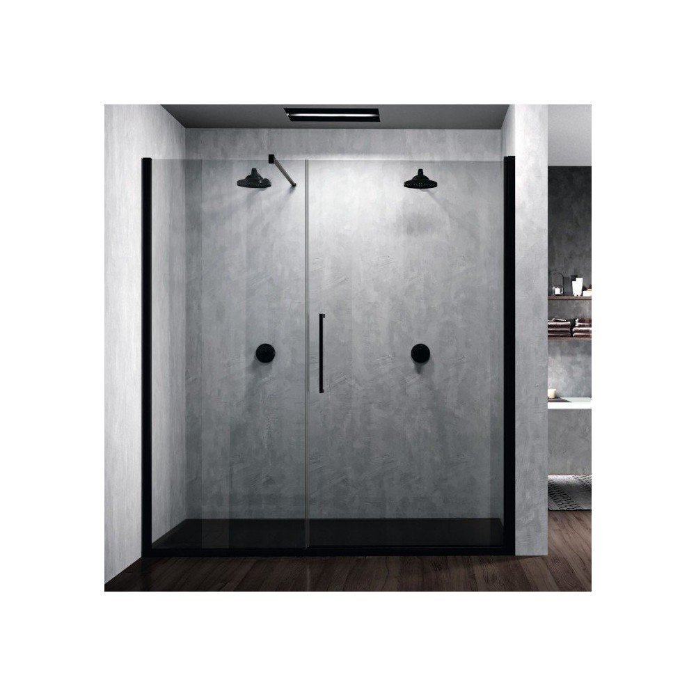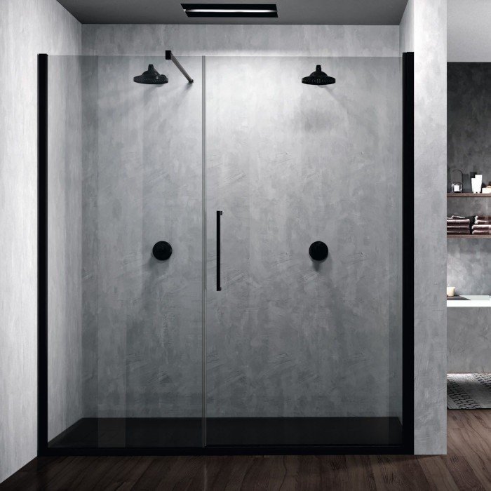 Modelo: Young G+F Black Novellini. Altura: 200 cm. Medidas: Anchos de 97 hasta 181 cm. Composición: Un vidrio fijo más un abatible. Vidrio: Templado de seguridad transparente. Grosor: 6 mm. Fácil limpieza: Tratamiento anti-cal de alta duración. Soporte: Brazo recto a pared negro mate. Perfiles: De aluminio anonizado. Color: Negro mate. Perfil inferior: Sin perfil inferior. Reversible: Si, se puede poner izquierda o derecha.