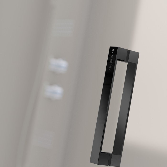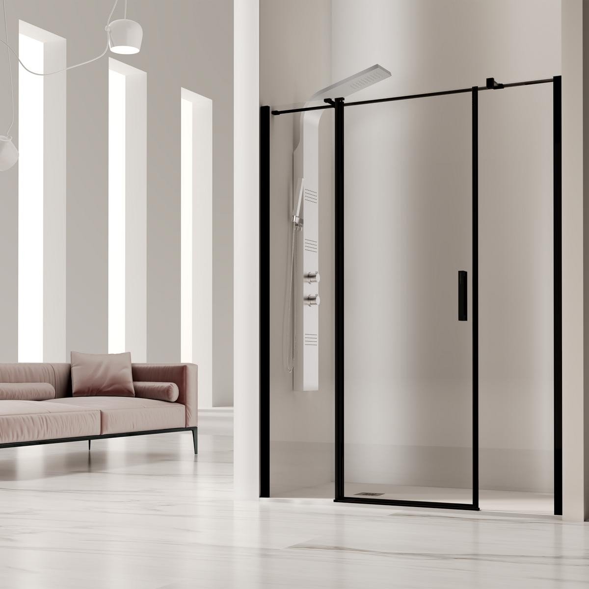 Mampara de ducha frontal con 2 hojas fijas y 1 puerta abatible en el centro, modelo Nardi NA517 en negro mate, es una mampara que lleva una barra de sujeción paralela, que evita tenrr que poner dos brazos de 45 grados.