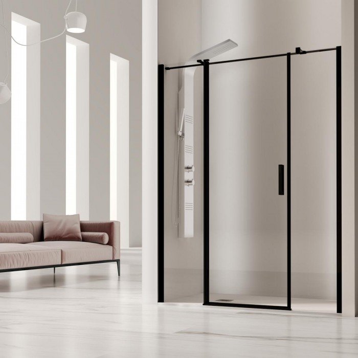 Modelo: Nardi NA517. Altura: 1,95 cm. Medidas: Anchos de 86 hasta 202 cm. Composición: Frontal dos fijos y una abatible central. Vidrio: Templado de seguridad transparente. Grosor: 6 mm. Fácil limpieza: Tratamiento anti-cal aplicado. Perfiles: De aluminio anonizado. Color: Negro mate. Soporte: Barra paralela. Perfil inferior: Sin perfil inferior. Cierre: Magnético. Reversible: Si, no hay que elegir lado.