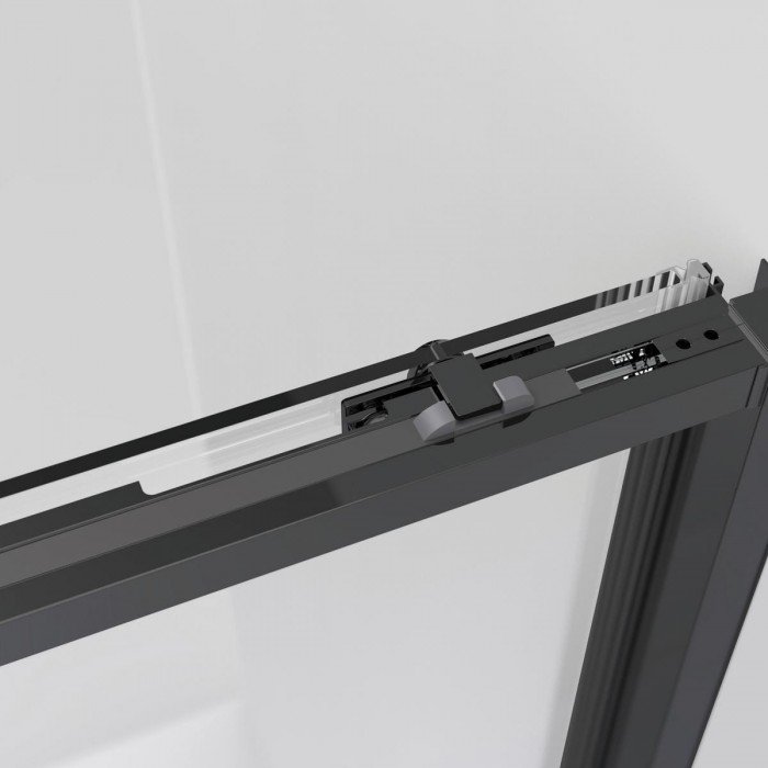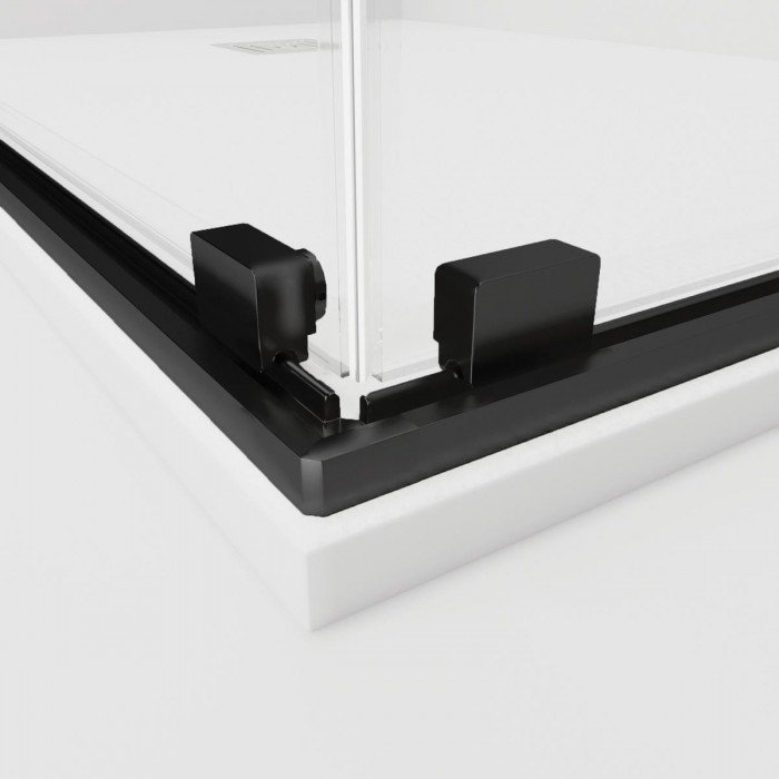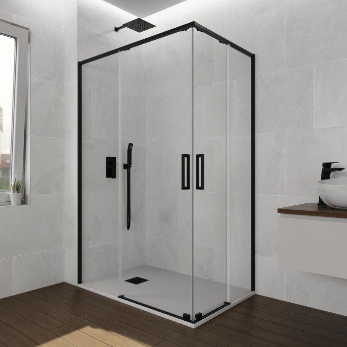 Modelo: Twenty. Altura: 1,95 cm. Medidas: Medidas desde 70 x 70 hasta 120 x 90 cm. Composición: Angular dos fijos más dos correderas. Vidrio: Templado de seguridad transparente. Grosor: Frontal 6 mm. Fácil limpieza: Tratamiento anti-cal aplicado. Perfiles: De aluminio anonizado. Color: Negro mate. Cierre: Amortiguado. Perfil inferior: Sin perfil inferior. Rodamientos: Superiores y regulables.