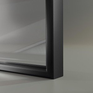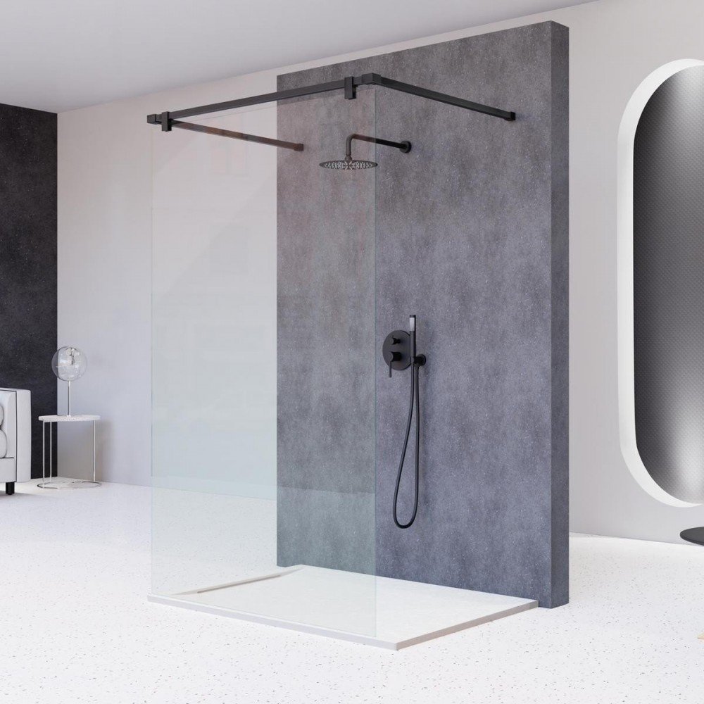 La mampara de ducha de una hoja fija de la serie Fresh Salomón, es una mampara muy útil gracias a su barra paralela de acero inoxidable negro mate de 90 grados y hasta 1'' cm de ancho por cada lado, que sustituye al brazo, queda una mampara en formato isla, los perfiles son en color negro mate y monta un vidrio de 8 mm templado de seguridad, con altura de 2 metros en total (contando barra).