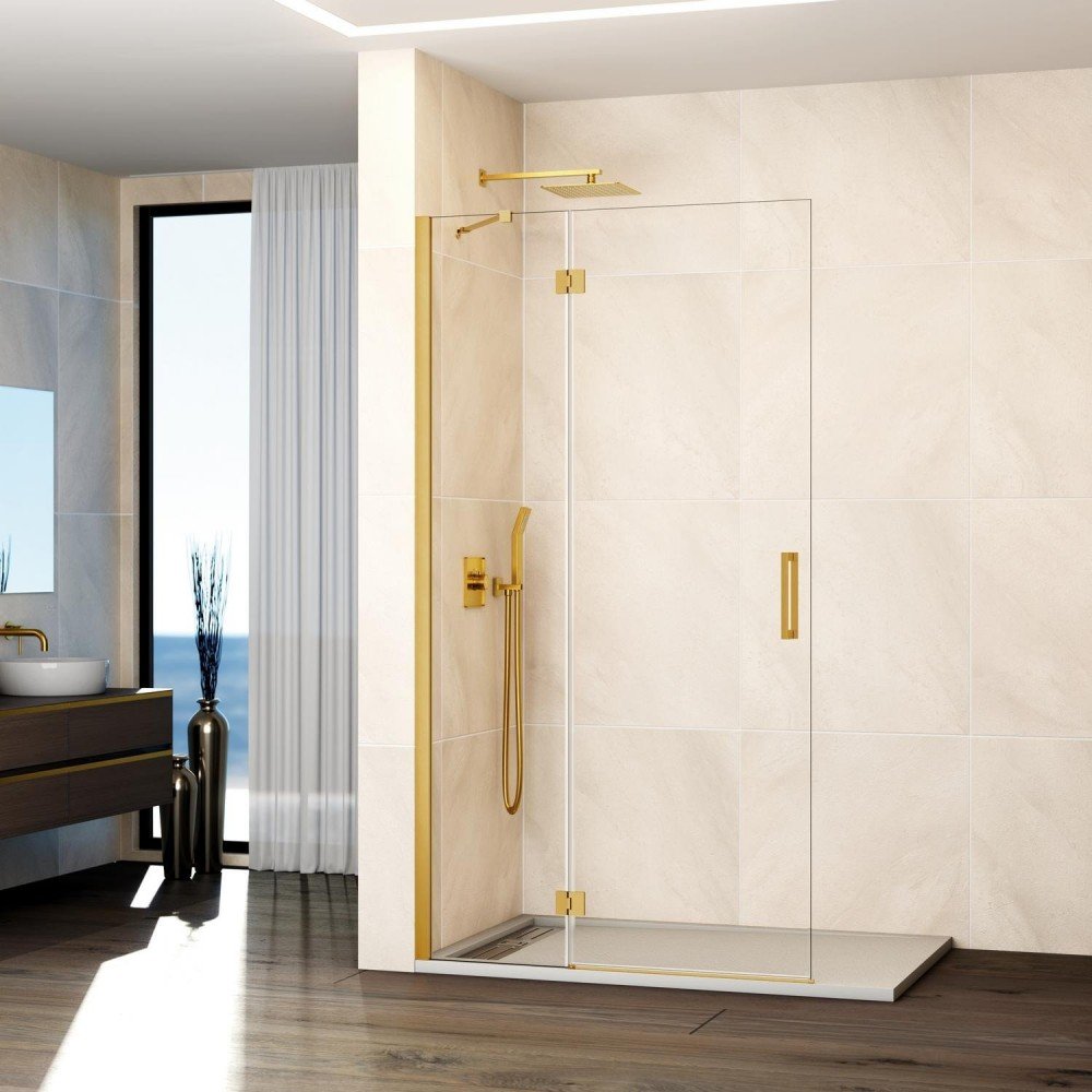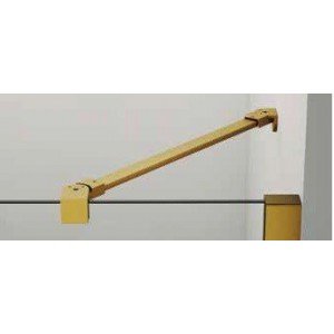 Mampara de ducha frontal con 1 hoja fija y una puerta abatible, modelo Glass Combi C free, en oro cepillado, es una mampara que lleva el fijo con un brazo articulado hasta 60 cm, entre el fijo y el abatible van unas bisagras de 90 grados, es decir solo abre hacia afuera.