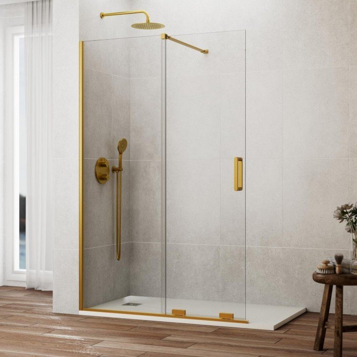 En resumen, la mampara Kenna en oro cepillado sin cierre es la solución perfecta para baños que necesitan flexibilidad en la instalación, como cuando un perfil de cierre no es viable debido a la disposición del espacio. Su diseño elegante, junto con el lujoso acabado en oro cepillado, hacen de esta mampara una opción ideal para quienes desean una combinación de funcionalidad y estilo en su baño.
