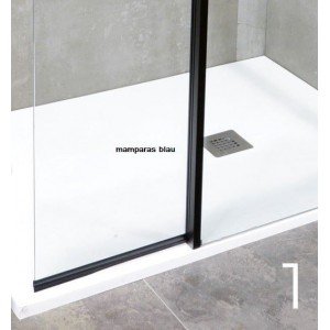 Modelo: Giro. Altura: 1,95 cm. Medidas: Anchos desde 105 hasta 125 cm. Composición: Un vidrio fijo más abatible. Vidrio: Templado de seguridad. Grosor: Fijo de 8 mm y abatible de 6 mm. Fácil limpieza: Tratamiento anti-cal aplicado. Soporte: Brazos articulado hasta 100 cm. Perfiles: De aluminio. Color: Negro mate. Reversible: Si, se puede poner izquierda o derecha.