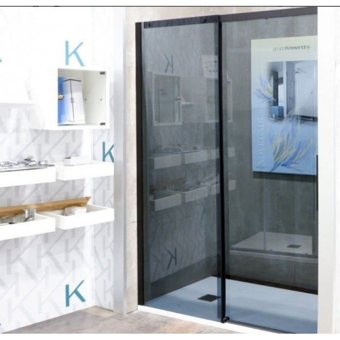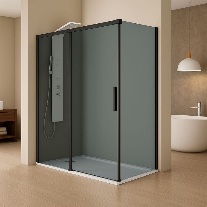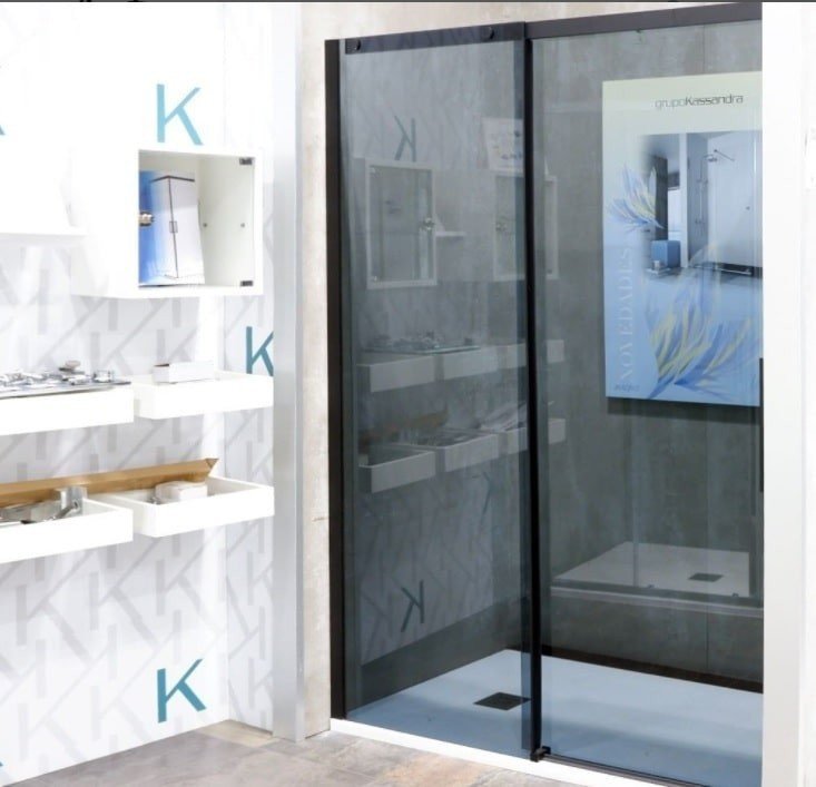 Diseño contemporáneo, mínima perfilería y una excelente relación calidad-precio. Vidrio templado de seguridad de 8 mm con tratamiento anti-cal y acabado ahumado para mayor privacidad sin perder luminosidad.