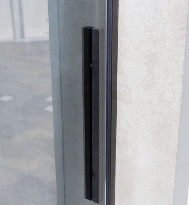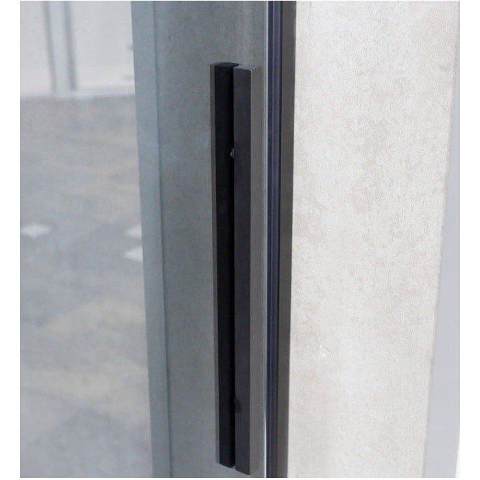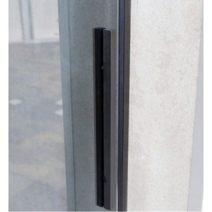 - Perfilería: aluminio en negro mate con poca perfilería y tirador largo.