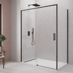 Mampara de ducha rectangular, formada por un fijo y una corredera más un lateral fijo. Modelo Twenty Black rectangular, está fabricada con una perfilería en aluminio de tan solo 20 mm en negro mate y ausencia de perfilería inferior, lo cual, le otorga una gran belleza minimalista a su diseño. Tiene un diseño increíble, es una de las mamparas con mejor diseño y calidad del mercado, y la única que incorpora el cierre amortiguado.