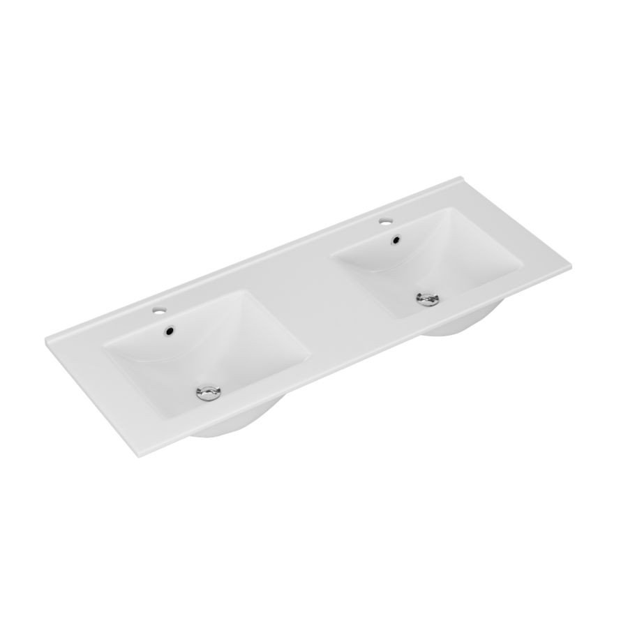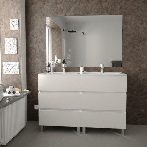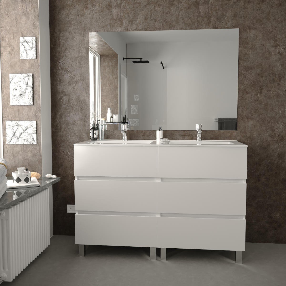 Mueble de baño en blanco brillo de 6 cajones con patas en cromo, medida 120 cm (2 x 60 cm), incluido lavabo de cerámica de dos senos blanco, no incluido espejo ni grifo.