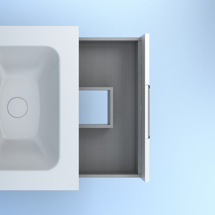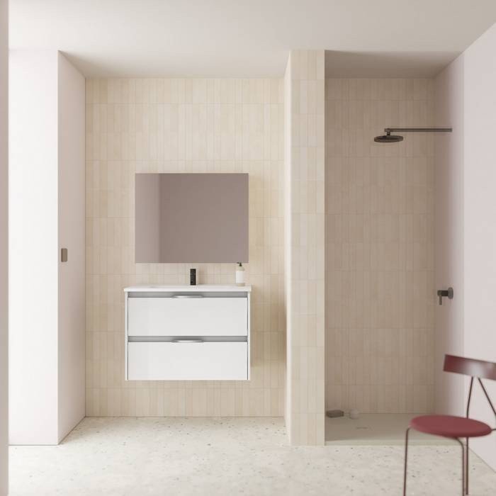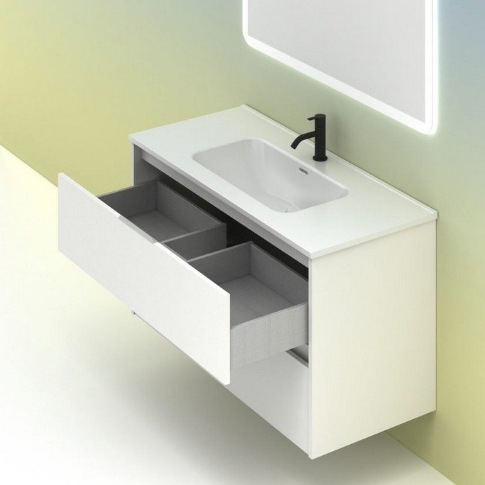 Mueble de baño en color blanco brillo suspendido, con 2 cajones, opcionales espejo y auxiliar.