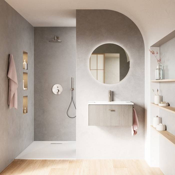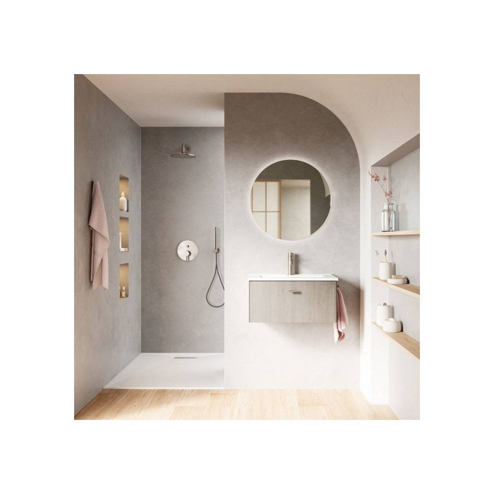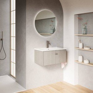 Mueble de baño en color roble blanco suspendido Mei, con 1 cajón, opcionales espejo y auxiliar.
