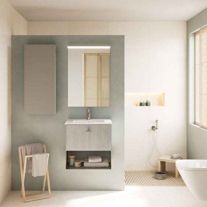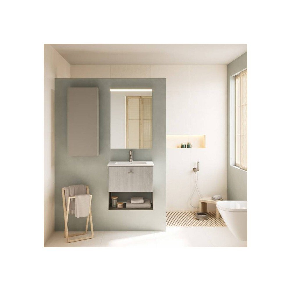 Mueble de baño en color roble blanco suspendido Mei, con 1 cajón y 1 hueco, opcionales espejo y auxiliar.
