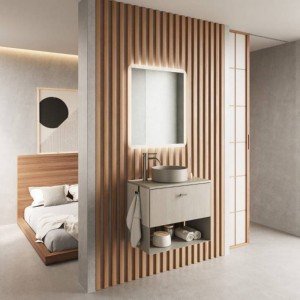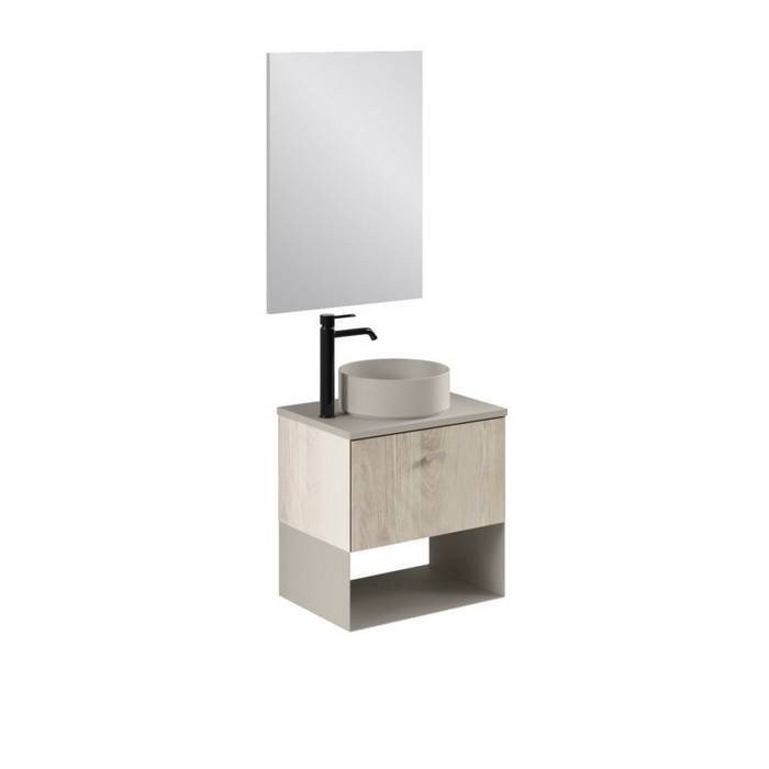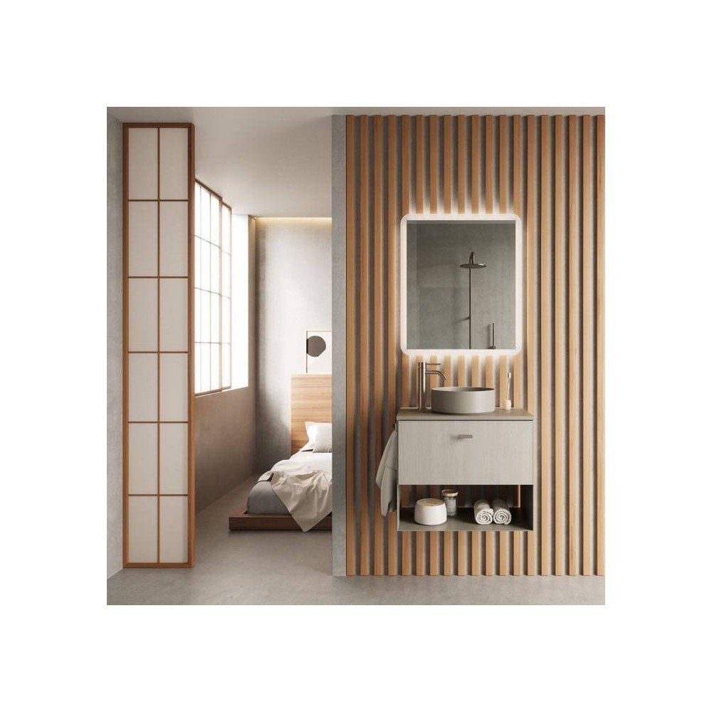 Mueble de baño en color roble blanco suspendido Mei top, lavabo sobre encimera, con 1 cajón y 1 hueco, opcionales espejo y auxiliar.